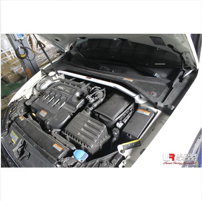Designed to fit without modifications* in order to stiffen the front end of the Golf 7 GTI / Golf 7 R / S3 8V / Leon 3, this Ultra Racing 2-points front upper strut bar has a high-density steel structure resistant to extreme stress and a very qualitative white finish in order to bring a sporty touch to the engine bay.